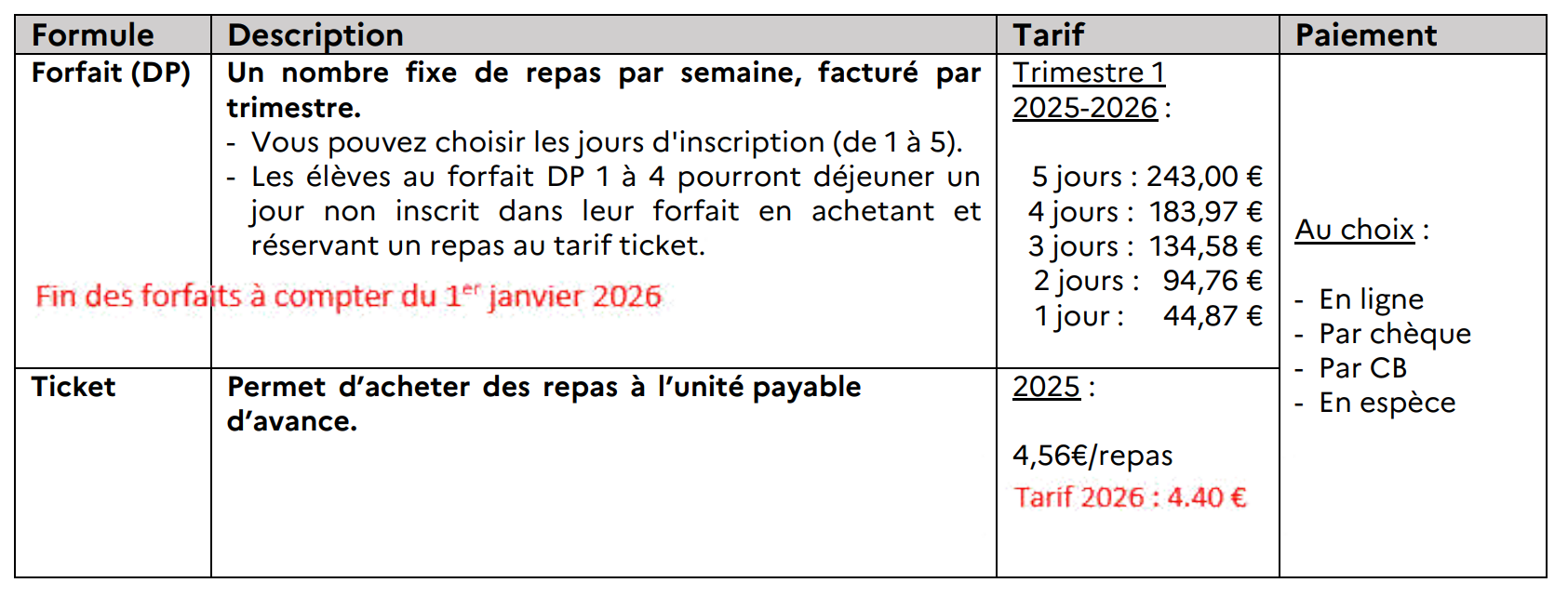 ⚠ Jusqu’au retour de la fiche intendance, votre enfant sera considéré inscrit à la formule ticket.