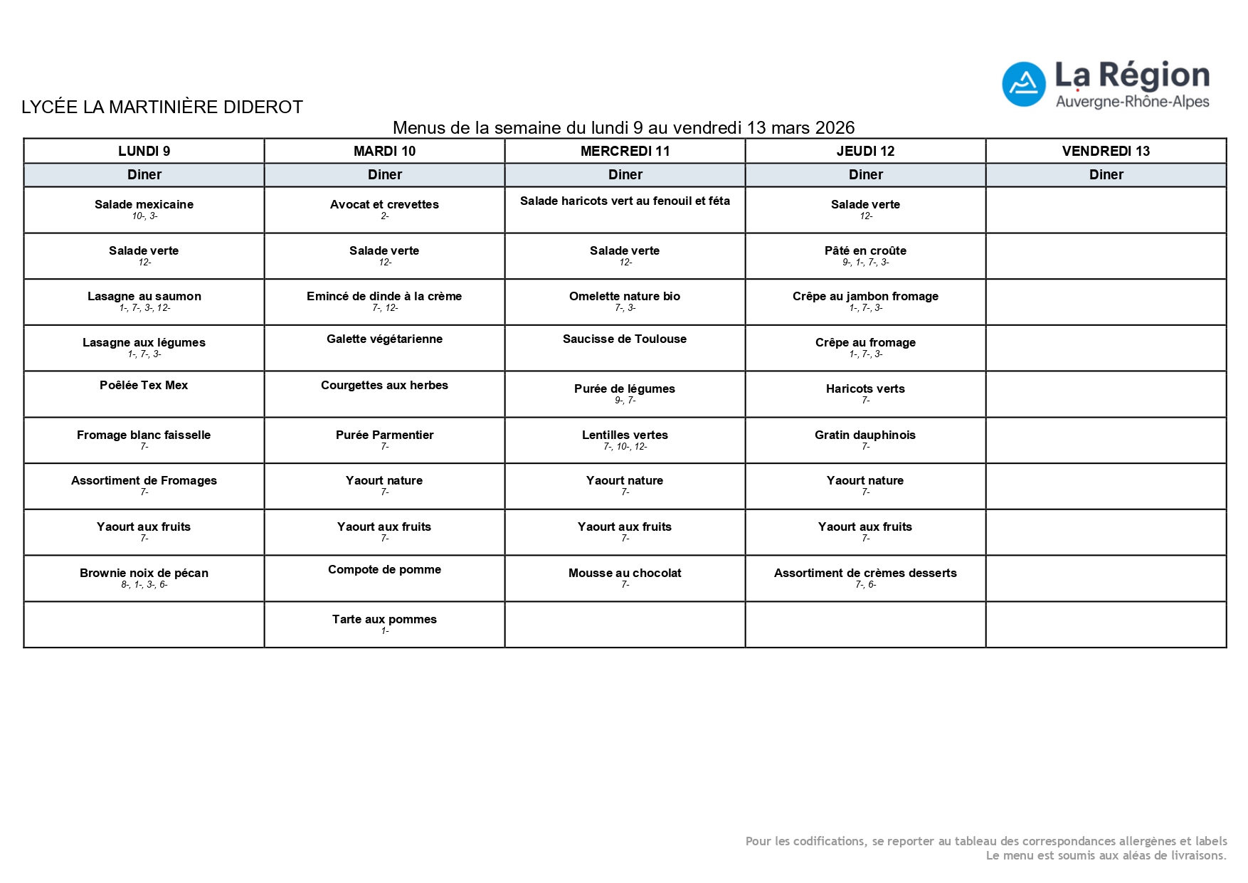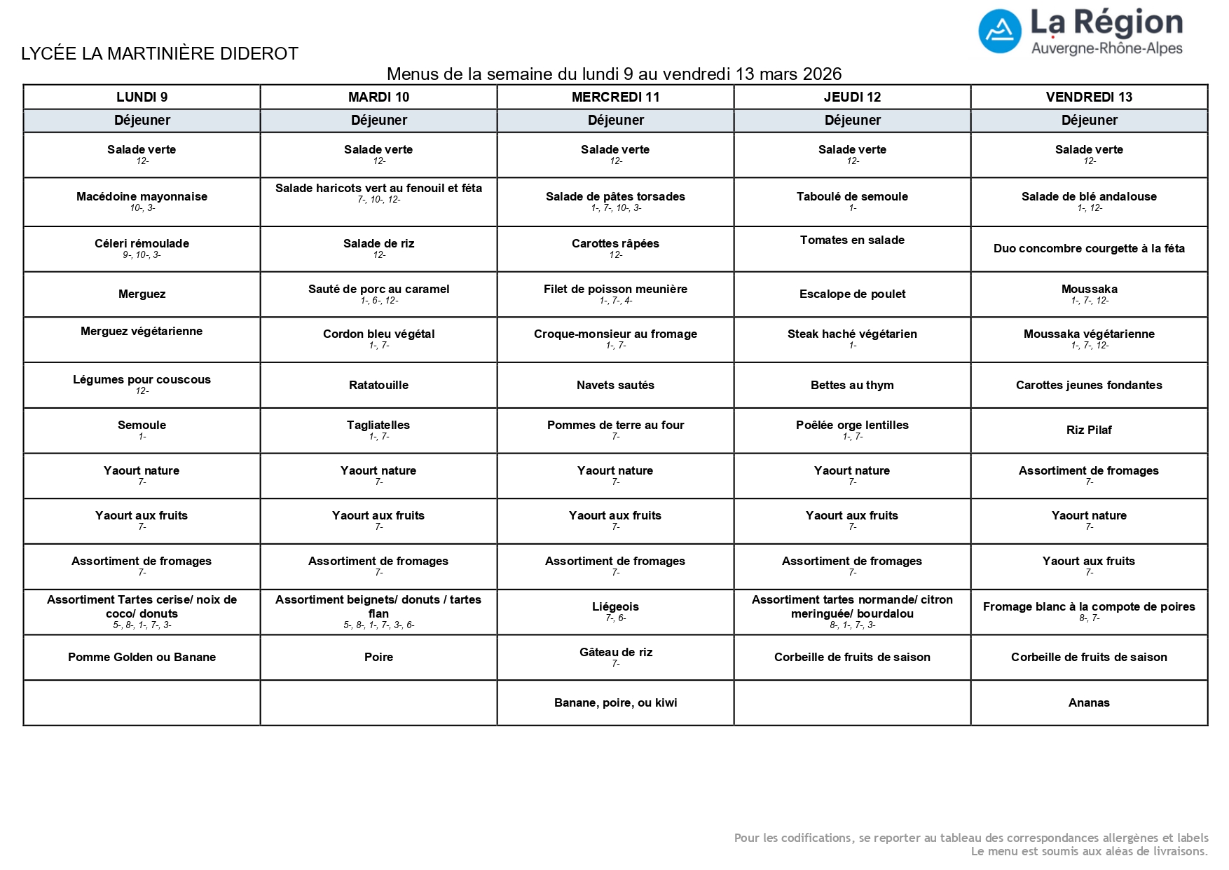 Menus de la semaine 11, du lundi 9 mars au vendredi 13 mars