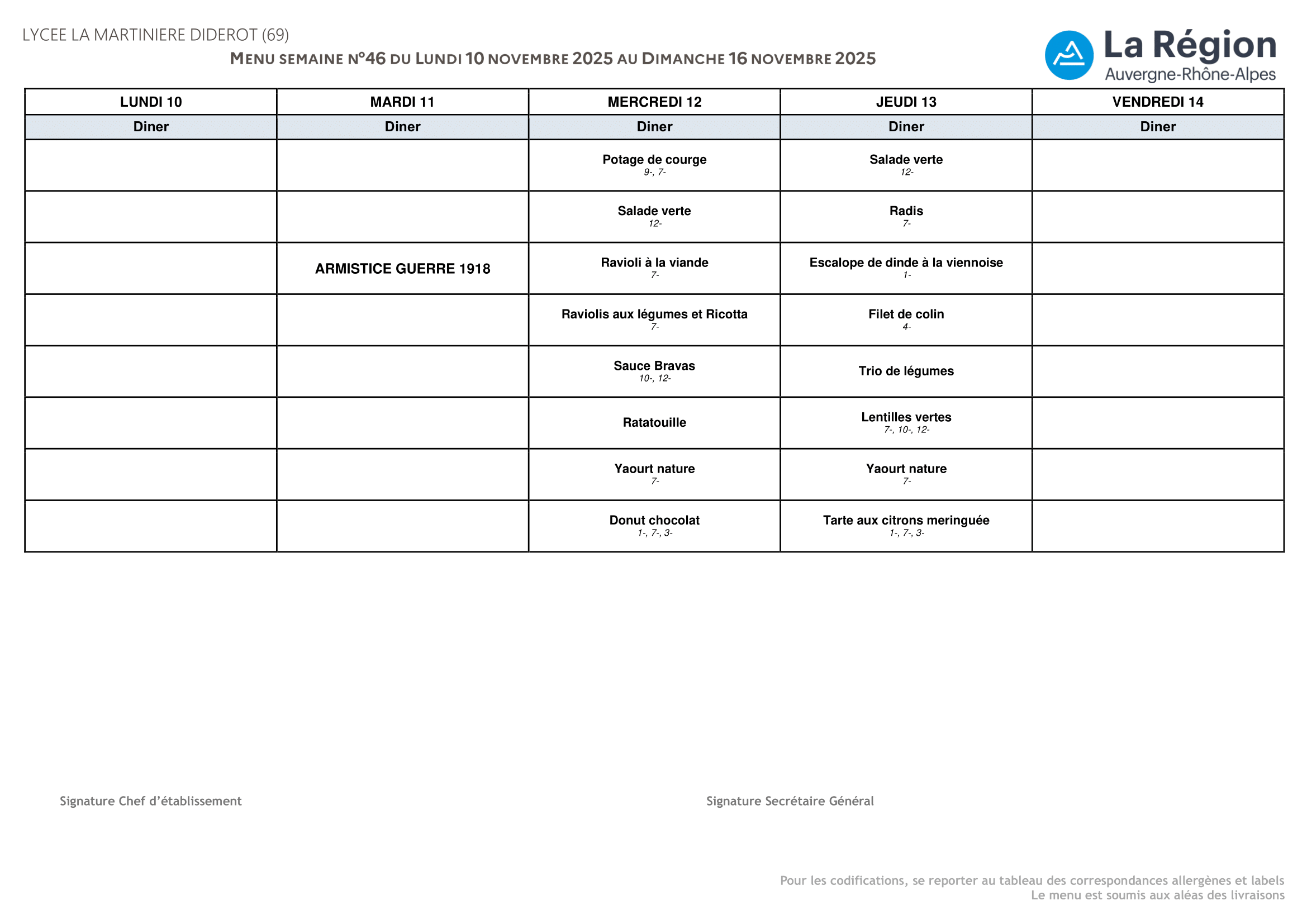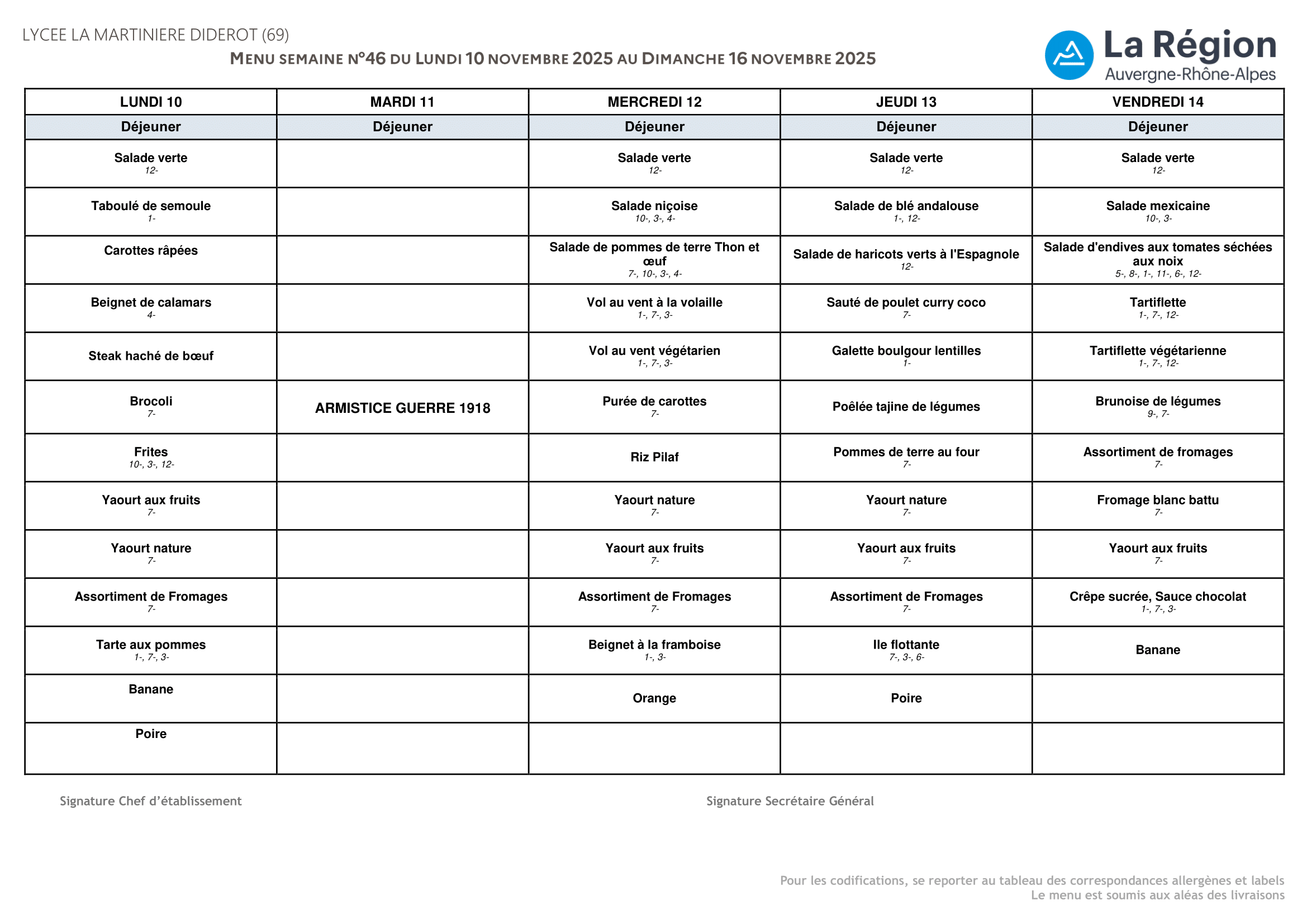 Menus de la semaine du 10 au 14 novembre 2025