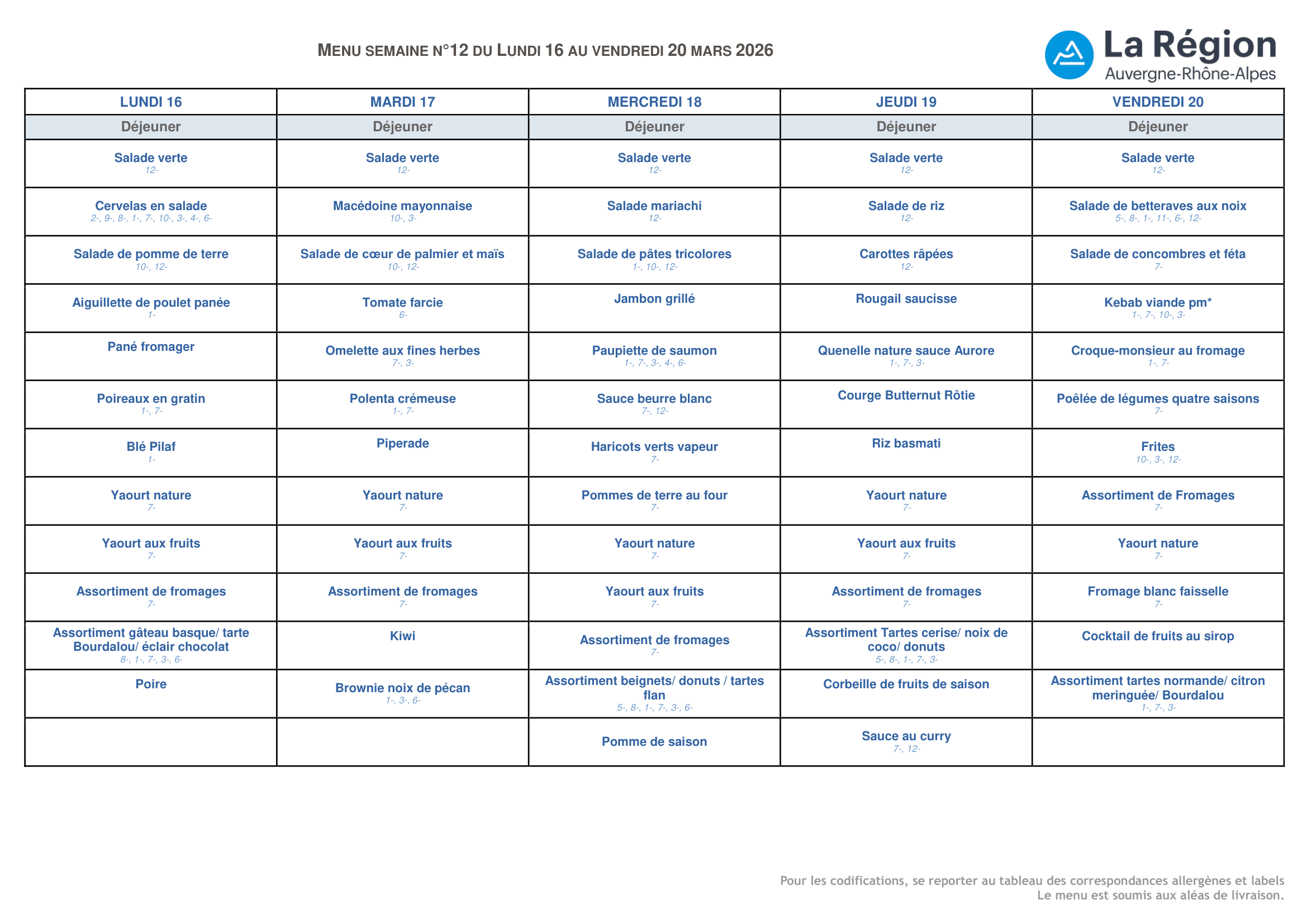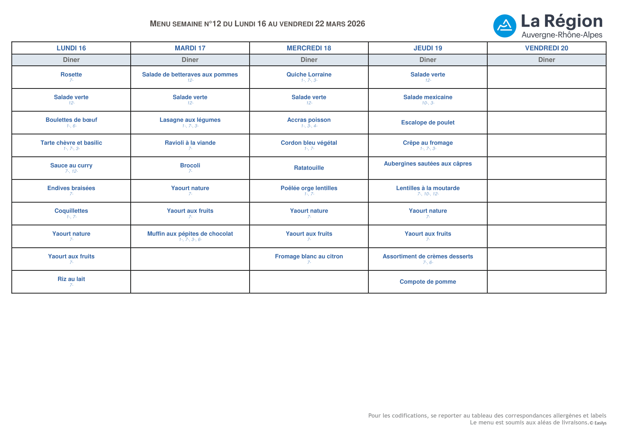 Menus de la semaine du 16 au 20 mars 2026