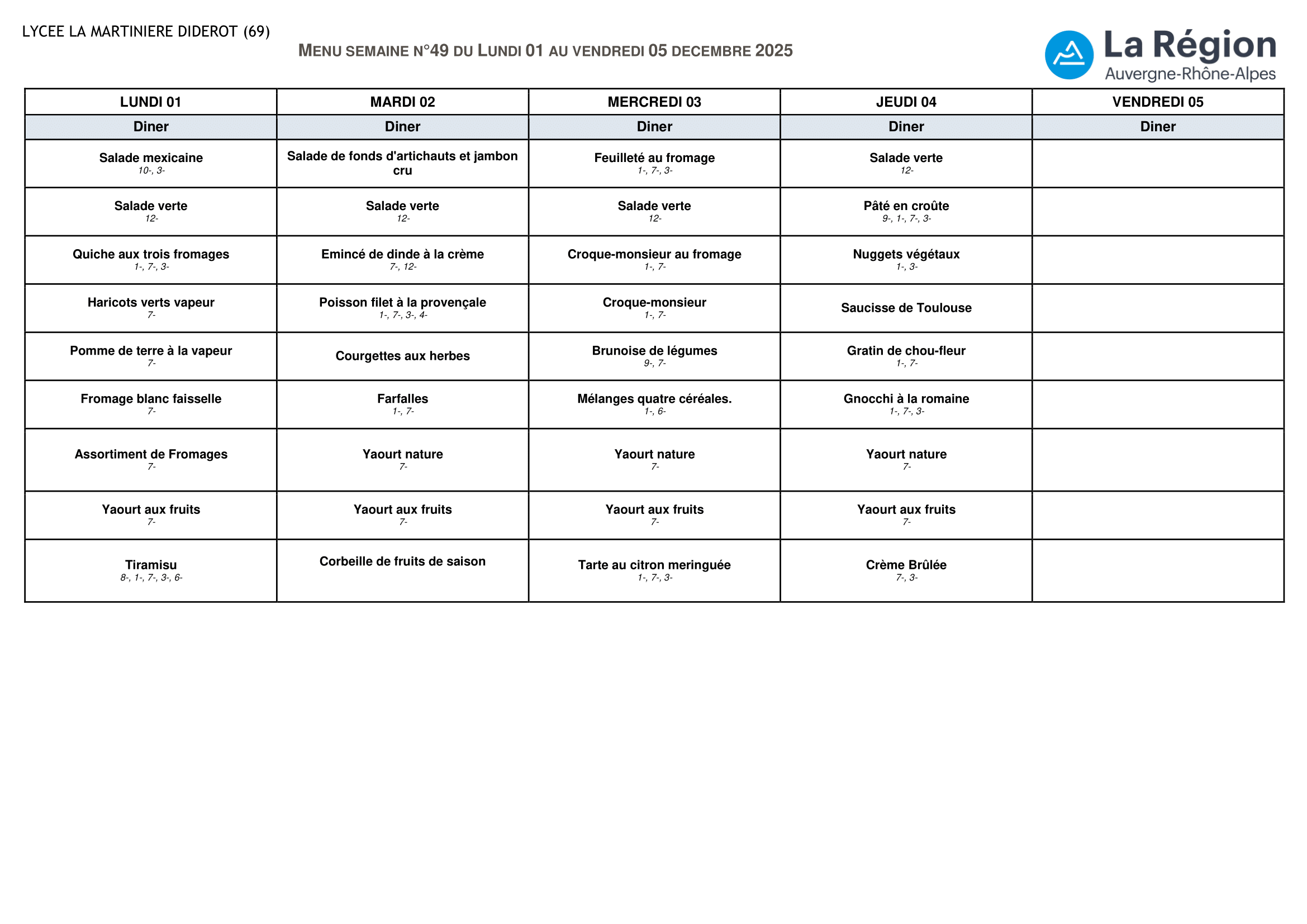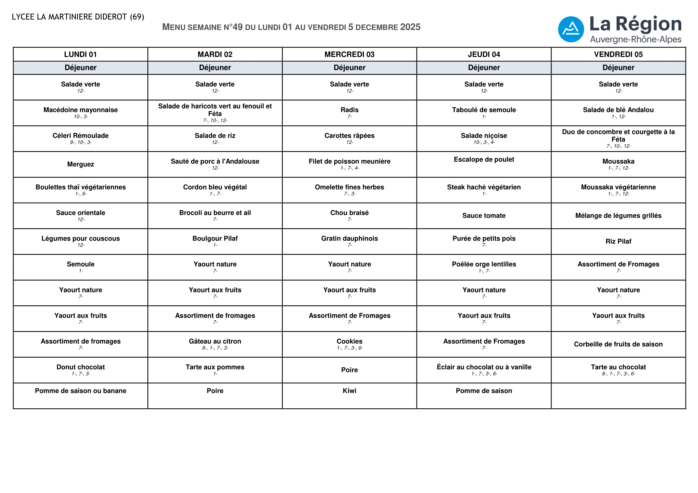 Menus du lundi 1er au vendredi 5 décembre 2025